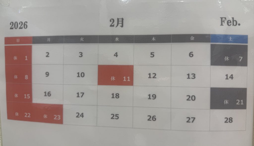 お知らせ&コラム info ホームお知らせ&コラム2月の診療日・休診日 2026.02.06 お知らせ 2月の診療日・休診日 2月の診療日・休診日は以下のカレンダーのようになっております。 2月は日数が少なく祝日もある関係で、 木曜日はすべて診療しております。 2026年が始まりあっという間に2月になりました。 今年のはじめに、目標を定めました。 「特別な何か」や「新しい挑戦」とかではなく 日々、繰り返している一つ一つのこと 当たり前のことを丁寧に、誠実に、思いを込めてやること 反省点はいつでも やるべきことをやってなかったとき 当たり前のことを丁寧に 積み重ねていくことに重きをおきたいと思います。 前の記事 一覧に戻る